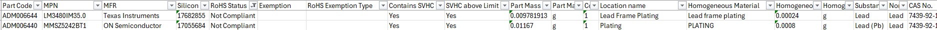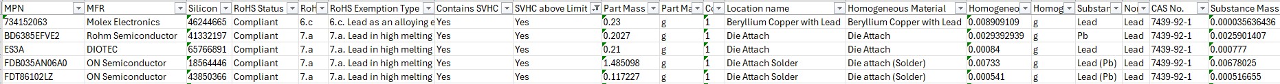 Situation 2. The part has RoHS status Not Compliant, SVHC, and is above the limit you will have all the detailed information (Substance Identification name, Homogeneous Material, Location name...etc) But without RoHs Exemption information