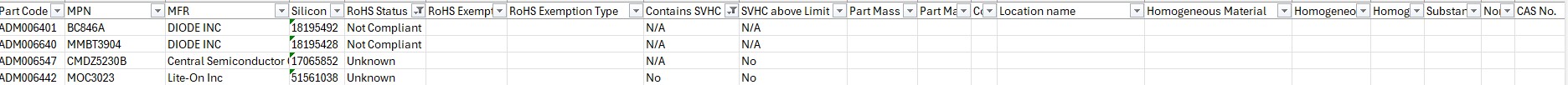 This report is available through Risk management module (that is connected to Silicon Expert to get conformity information in Buymanager). For more information, please see dedicated article here. Reminder : Risk management module is optional and requires an additional licence, please contact our sales team if needed : sales@buymanager.biz This report provides detailed information on RoHS substances following the risk assessment. It includes comprehensive data on SVHCs (Substances of Very High Concern) when their levels exceed the specified limits, as well as any additional RoHS-related explanations. You can export all relevant details from this report for further analysis.