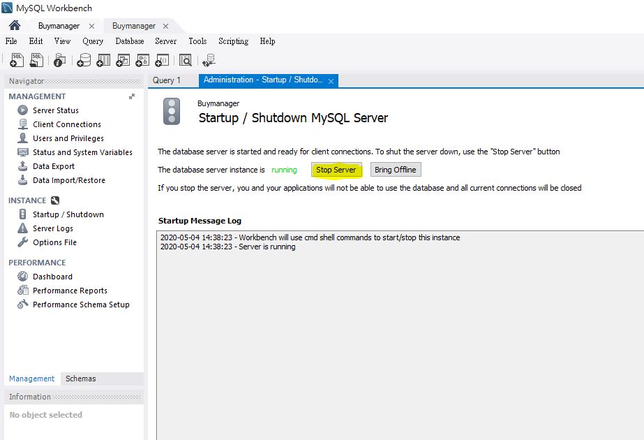 - Go to "INSTANCE" >>"Startup/Shutdown" >> "Stop the server"