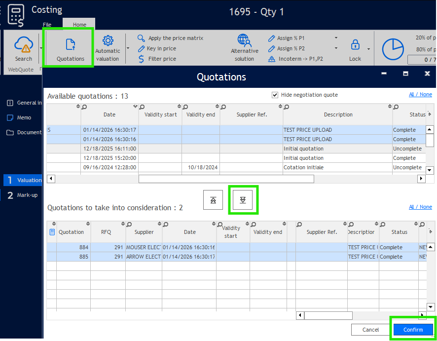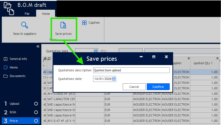 Save pricesbutton. - Quotation Name: You will be prompted to specify a name for this quotation. This name should clearly identify the prices and the relevant date (e.g., "Customer X BOM Prices Q4 2025").