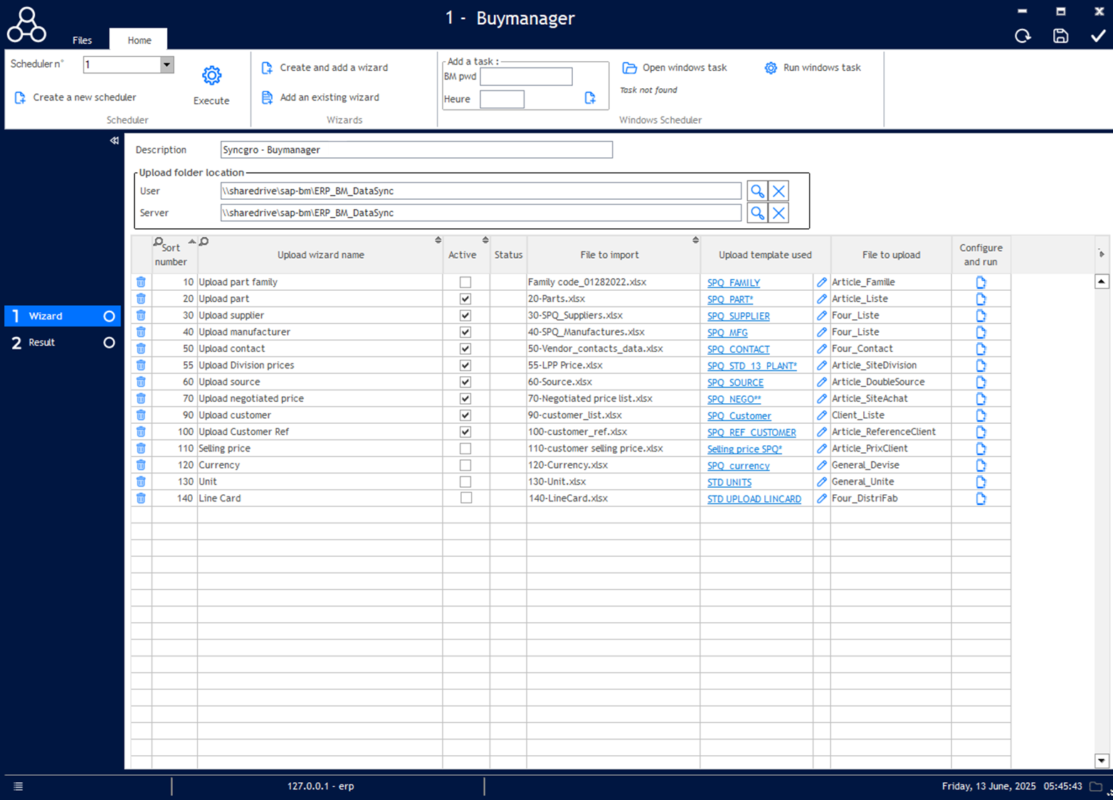 - Execute: Manually execute for all the uploads of the ERP upload templates if the active is ticked