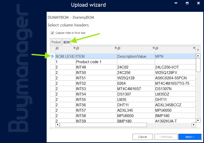- This feature enables the simultaneous import of multiple product BOMs (e.g., for various circuit boards) into Buymanager using a specially formatted Excel file.