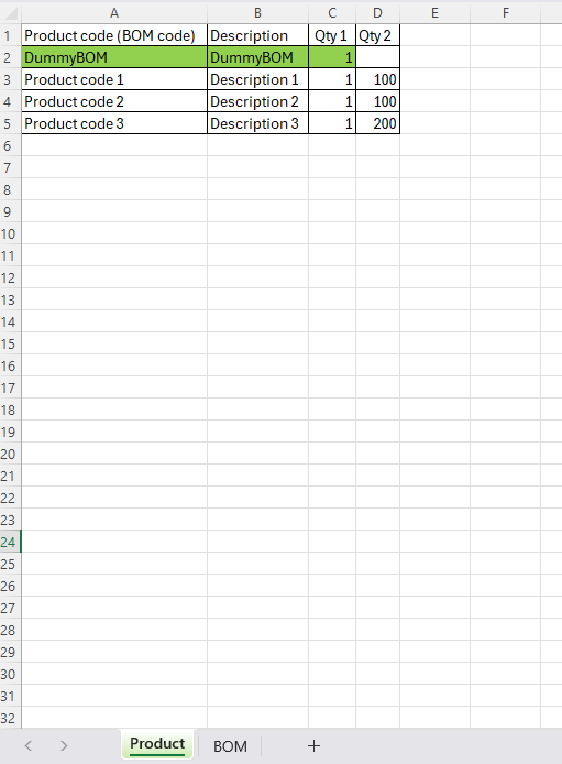 product code (BOM): The unique identifier for your finished product.Description: A brief description of the finished product.Quantities: The quantity of each finished product.