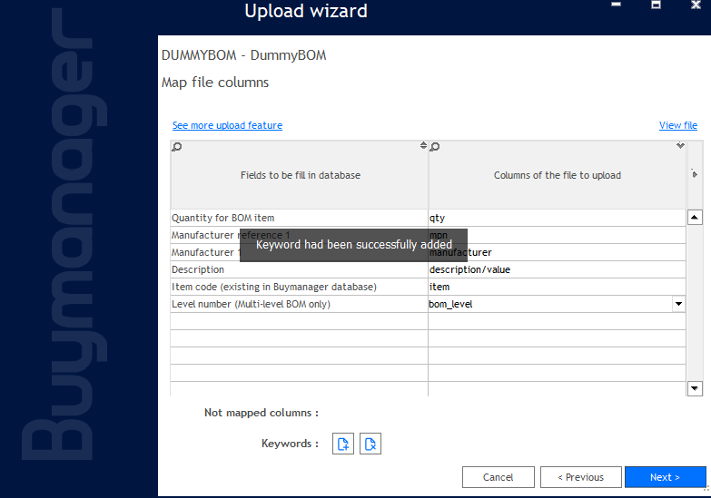 8.Map Columns: Carefully map all the columns from your Excel file to the corresponding fields in Buymanager.biz. Don't forget to map the two newly added columns (Item Code and Level Number)!