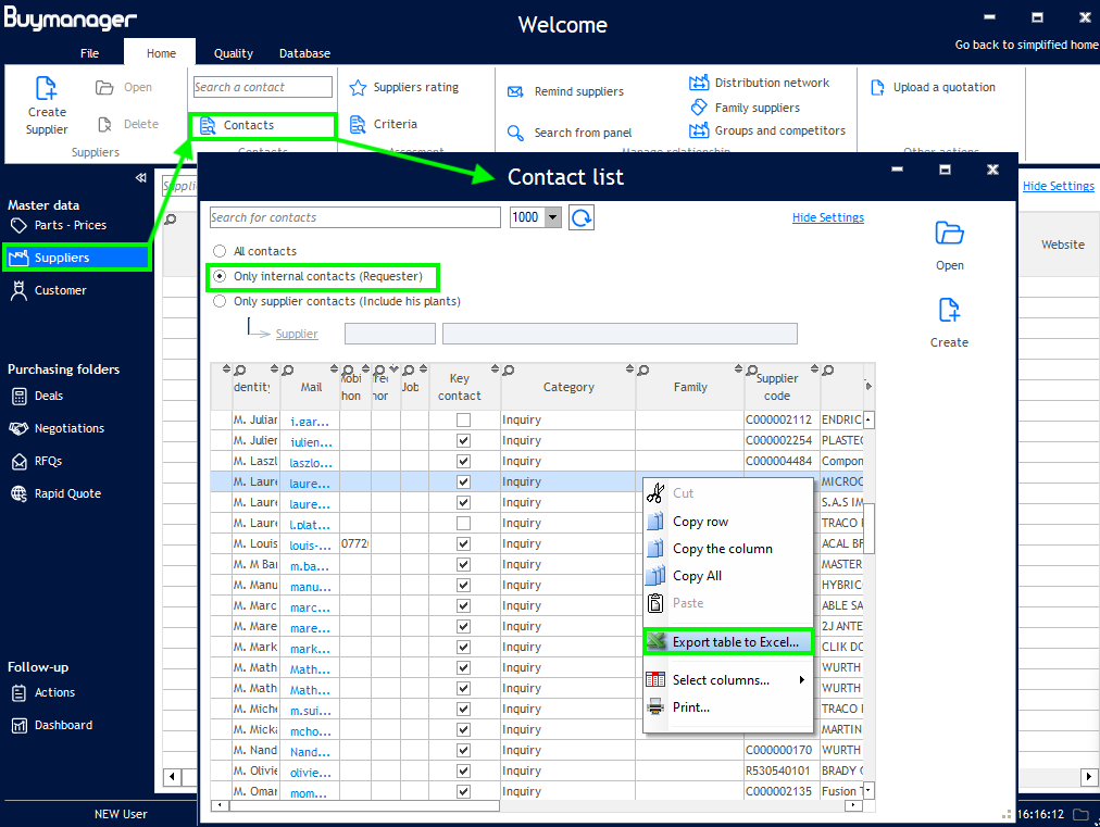 3. Apply a filter to display "only supplier contacts". This ensures you export the relevant data.