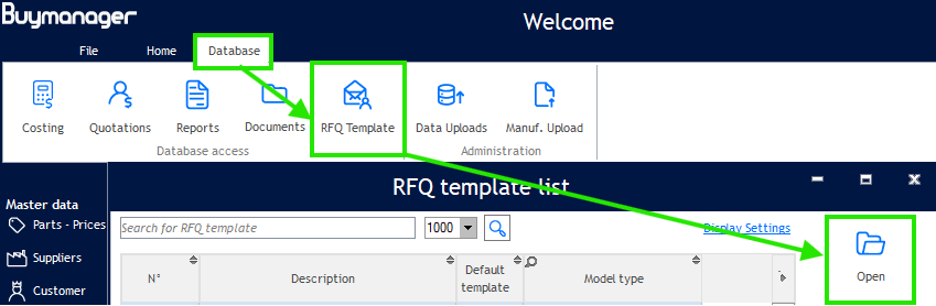 Databasetab, chooseRFQ template. - Open the Default Template: Open the default RFQ template