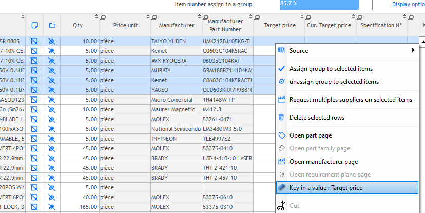 - Enter Your Target Prices: Now you can manually enter your desired target price and its corresponding currency for each item. Just click into the cell and type! You can also select multiple cells, right click and select "key in a value: Target price" to add a price to the select lines.