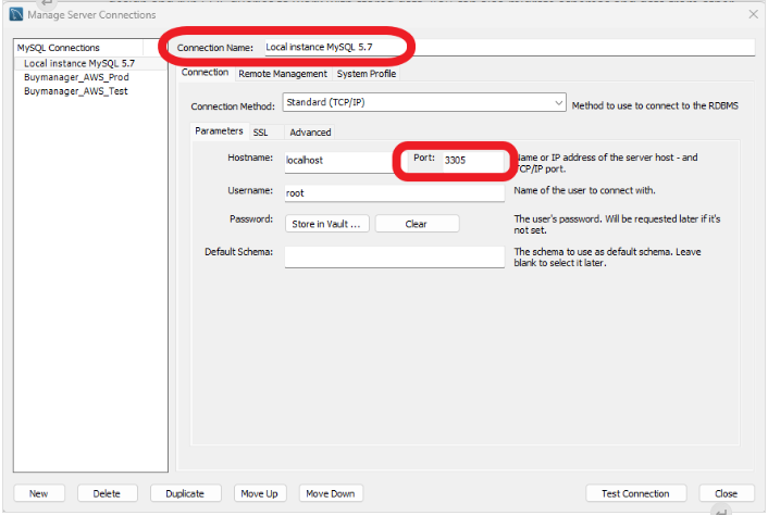 - Modify MySQL Workbench settings (change access port and rename to "Local instance MySQL 5.7")