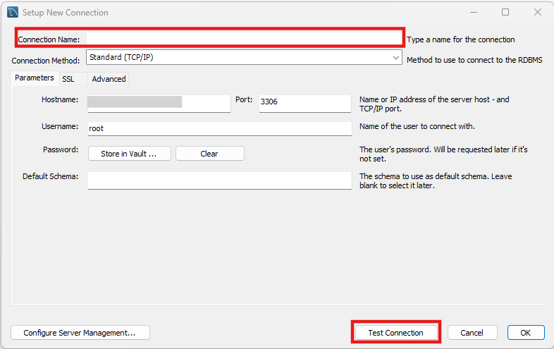 - Name the connection and fill in the hostname (IP adress) and port number (3306)