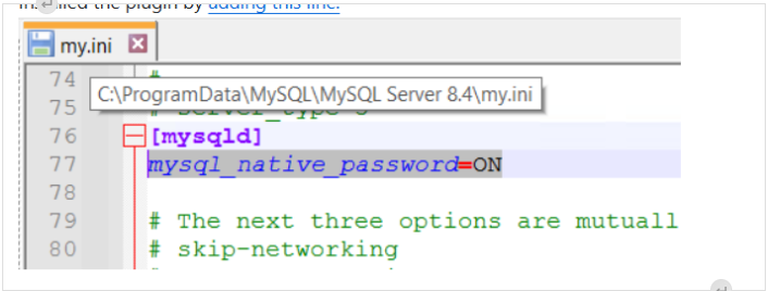 Please note: If you update 8.2 > 8.4 and you have password issue "Failed to Connect to MySQL at 127.0.0.1:3306 with user root" Plugin 'mysql_native_password' is not loaded, you have to add this line to “my.ini” just under [mysqld] :