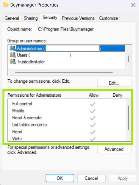 C:/Buymanager(the drive letter may vary depending on your system). - Ensure this newly created folder has Write/Read/Modify has permission enabled (Right-click the folder, go to "Properties" > "Security" tab > "Edit" > select the user/group > check "Full control" )