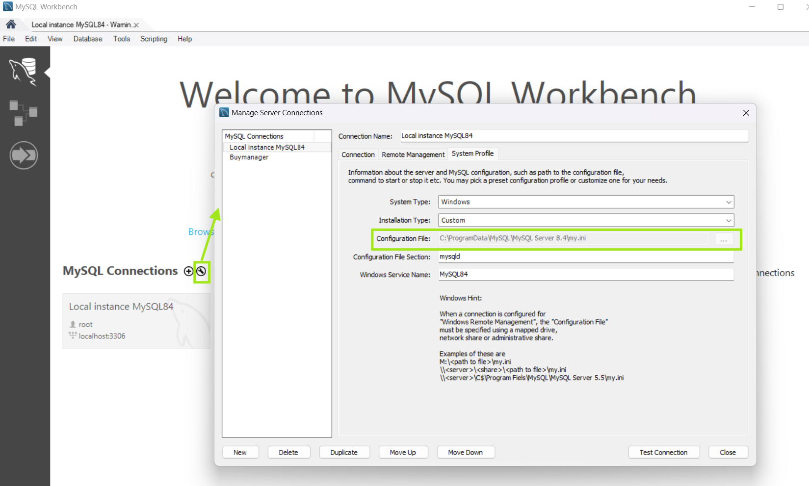 Ensure both the "Local instance MySQL84" and "Buymanager" connections. point to the same directory for the my.ini file.
