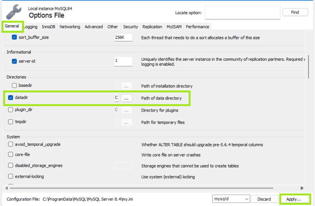 C:/ProgramData/MySQL/MySQL Server 8.4/Data. If you need to change this location, update the directory path accordingly. - Important Note: