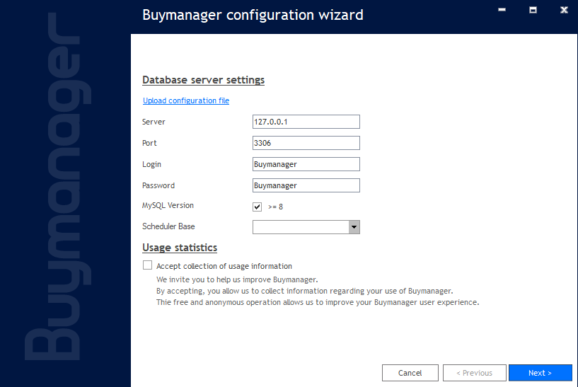 - Administrator rights on the server where Buymanager and MySQL will be installed.
