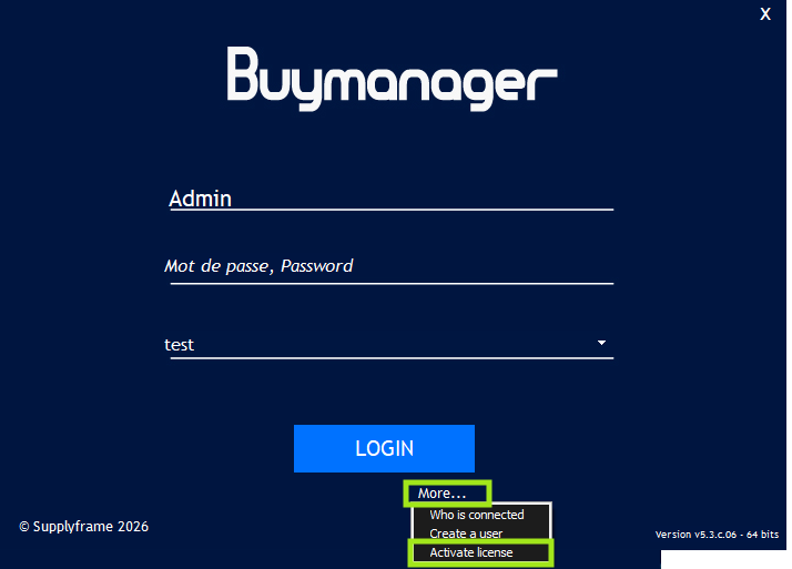 - After you finish installing the database, you will be brought back the one Buymanager Login page. If you have multiple database, select the database you just install. Go to More > Activate License